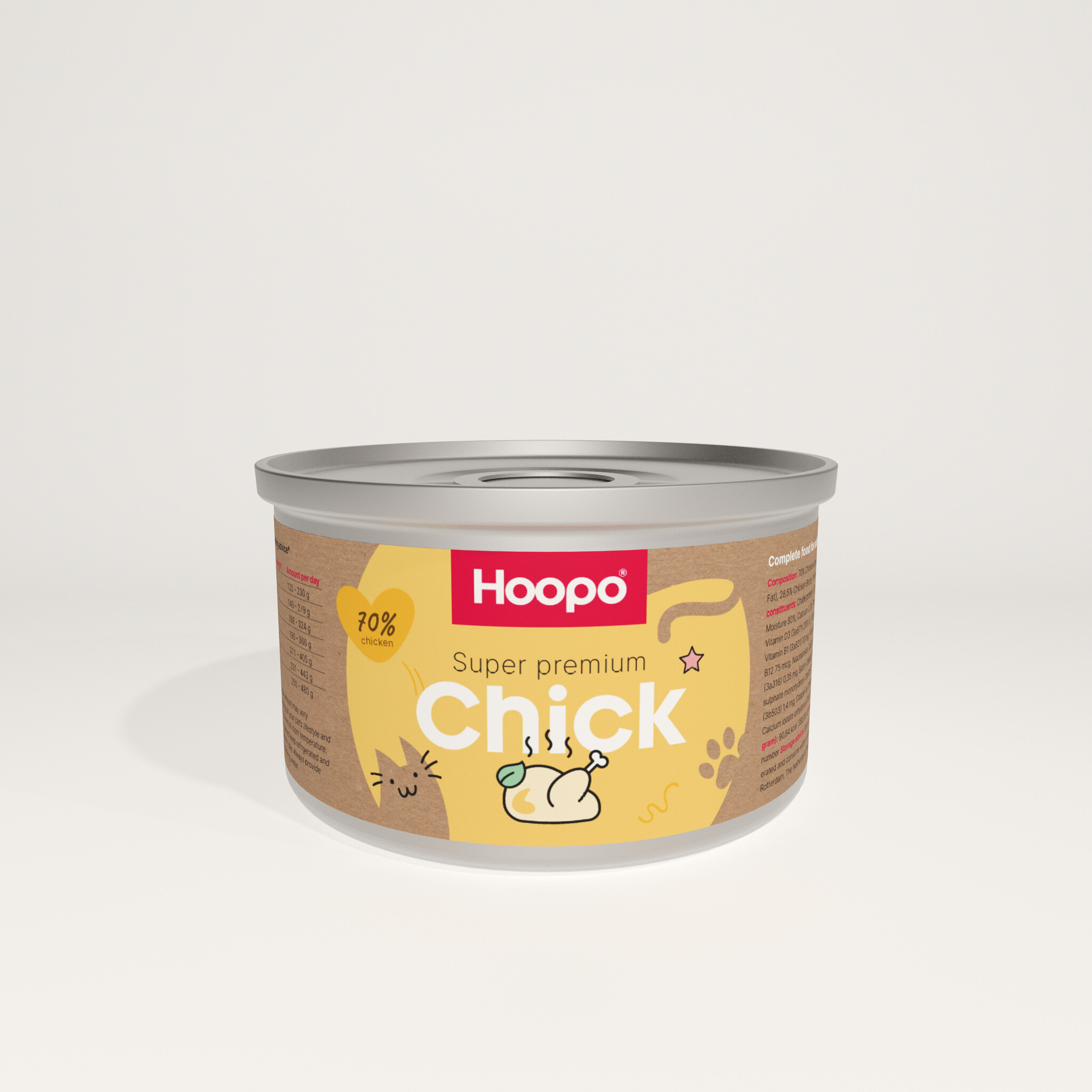 Super Premium Chick pâté has been specially developed for adult cats. It contains exactly the right combination of vitamins for your cat. These include vitamin D3, vitamin E, vitamin B6, biotin, zinc and taurine. Taurine is important in cat food. Cats do not produce this amino acid themselves, but they do need it. Taurine is involved in the functioning of the heart, the immune system, the formation and removal of bile acids and the eyes (night vision). Fortunately, your cat is the only one staring at you at night... because he wants steak again!