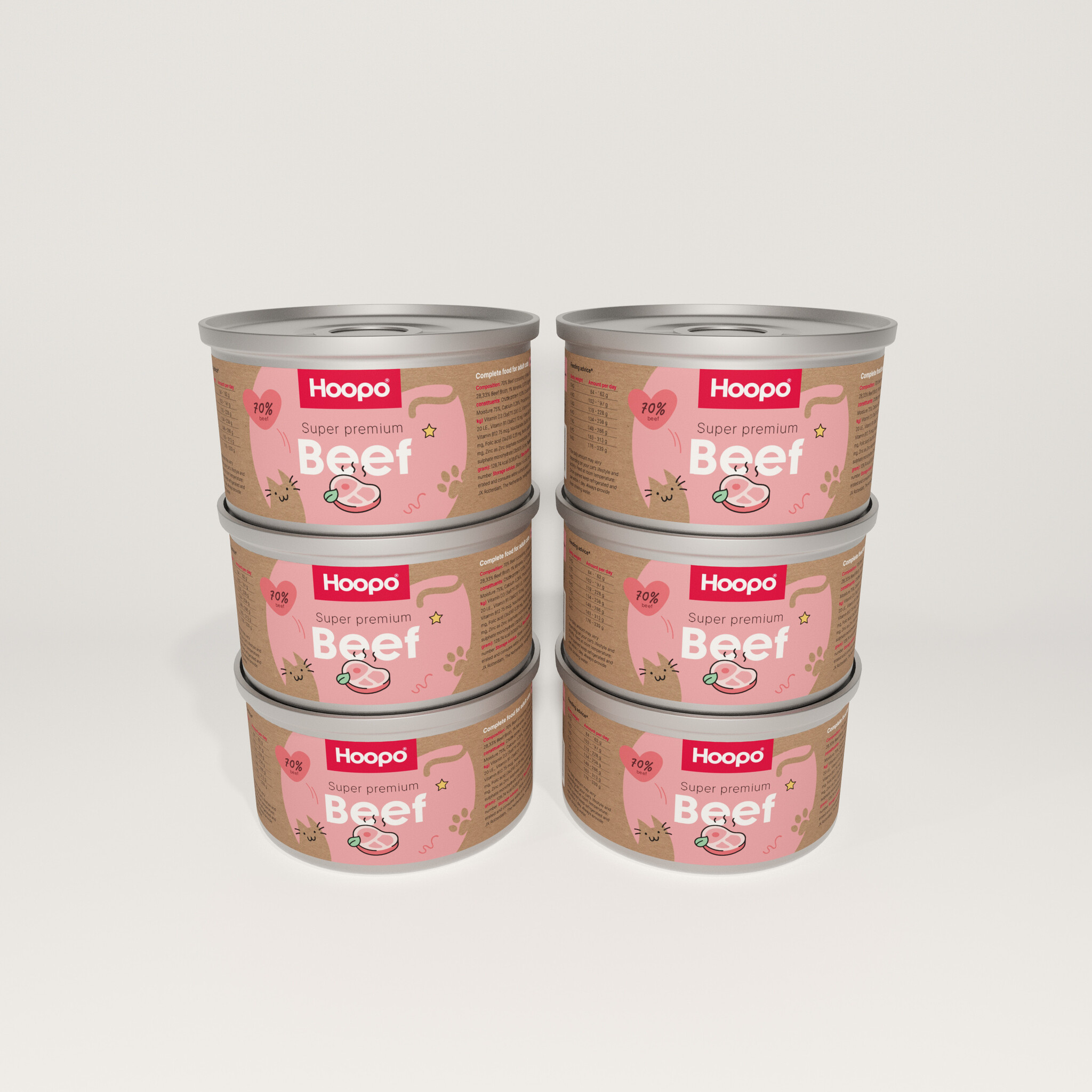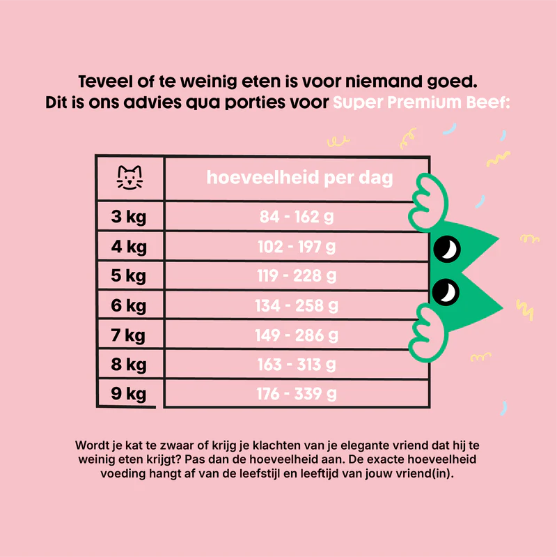 Super Premium Beef paté is specifiek ontwikkeld voor volwassen katten. Het bevat precies de juiste samenstelling met vitaminen voor je kat. Denk bijvoorbeeld aan vitamine D3, vitamine E, vitamine B6, biotine, zink en taurine. Taurine is belangrijk in kattenvoer. Katten maken dit aminozuur niet zelf aan, maar ze hebben het wel nodig. Taurine is betrokken bij de werking van het hart, het immuunsysteem, het vormen en afvoeren van galzuren en de ogen (nachtzicht). Gelukkig is je kat ‘s nachts de enige die naar je staart.. omdat hij weer biefstuk wil!